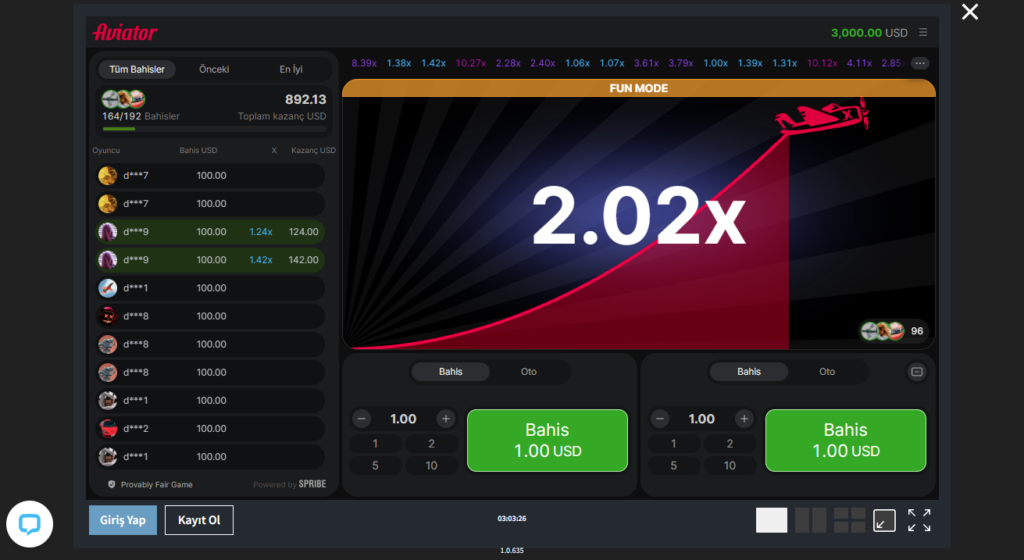 Aviator, Spribe tarafından geliştirilen, tamamen rastgele sayı üreteci (RNG) ile çalışan, çarpan bazlı bir crash oyunudur. Oyunun temel amacı, uçak havalanırken çarpan yükselmeden önce “cash out” yaparak kazancınızı almak.